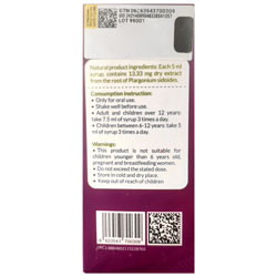 توضیحات: این فرآورده یک محصول طبیعی بر پایه گیاه Plargonium sidoides است که با داشتن خاصیت ضد میکروبی و تقویت کنندگی سیستم ایمنی، به بهبود علائم سرما خوردگی نظیر گلودرد، سرفه، بی حالی و ... کمک چشمگیری می کند. هر 5 میلی شربت، حاوی 13.33 میلی گرم عصاره خشک ریشه گیاه پلارگونیوم سیدوئیدس است. سایر اجزاء فرآورده شامل: عسل، سوربیتول، پتاسیم سوربات، اسانس لیمو، اسید سیتریک و آب می باشد. منبع: بهدارو / داروکده