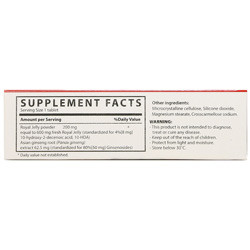 هر قرص حاوی 200 میلی گرم رویال ژلی استاندارد شده بر اساس وجود 4% ترکیب 10-HDA معادل 8 میلی گرم ماده موثره همراه با 62.5 میلی گرم عصاره ریشه جینسنگ آسیایی (Panax ginseng) استاندارد شده بر اساس 80% جینسنوزید معادل 50 میلی گرم ماده مؤثره است. اثرات فارماکولوژیک و مکانیسم اثر : ترکیبات مؤثره گیاه جینسنگ شامل ساپونین ها و یا گلیکوزیدهای تریترپنوئید است که مجموعاً به عنوان جینسنوزید ها شناخته می شوند. ساب تایپ های مختلفی از جینسنوزیدها شناسایی شده اند. جینسنوزیدها طیف وسیعی از اثرات مانند تاثیر برفشار خون، میزان قند خون ، سیستم اعصاب مرکزی ،تاثیر بر تجمع پلاکتی و انعقاد خون،تولید فاکتور رشد اعصاب،محافظت سلول های عصبی و غیره را اعمال می کنند. شواهدی وجود دارند که جینسنگ از طریق اثر بر محور هیپوتالامیک HPAو غلظت کورتیزول خونی بر کنترل استرس تاثیرمی گذارد،به همین دلیل به طور وسیعی به عنوان عامل تقویت کننده و مقابله با استرس به کار می رود.همچنین جینسنگ دارای اثرات ضد سرطان ،ضد تومورو تقویت سیستم ایمنی می باشد که این اثر را از طریق تحریک سلول های Natural killer و سایر فعالیت های ایمنی و کاهش تولید فاکتور نکروز توموری و جلوگیری از شکستن DNA اعمال می کند
