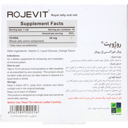 - هر ویال خوراکی حاوی 2000 میلی گرم ژل رویال (حاوی 1.5 درصد 10HDA) میباشد سایر ترکیبات: ویتامین C، گلوکز مایع و طعم دهنده پرتقال