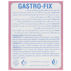 کاستروفیکس غذایی ویژه و فاقد لاکتوز است. این محصول، غذایی کامل برای استفاده در طی روند اسهال حاد است که جهت رفع نیازهای تغذیه ای نوزادان و کودکان بلافاصله پس از ORS درمانی موفق مصرف می شود. گاستروفیکس غذای ویژه بوده که قابل استفاده از بدو تولد می باشد. این محصول در موارد عدم تحمل لاکتوز و سایر اختلالات عضمی، به راحتی قابل هضم می باشد. گاستروفیکس به طور موقت جایگزین رژیم معمول به مدت 5 تا 7 روز می شود. این محصول جایگزین شیر مادر نیست. تغذیه با شیر مادر در طول مدت اسهال باید ادامه یابد. مگر اینکه پزشک دستور دیگری بدهد. ترکیبات: برنج پیش پخته شده، پودر موز، مالتودکسترین، پودر سیب، کازئینات سدیم، روغن های گیاهی، مواد معدنی، وی پروتئین فاقد لاکتوز، لسیتین سویا، ویتامین ها. مواد اولیه این محصول تامین شده توسط FASSKA کشور بلژیک و در ایران تولید و بسته بندی شده است.