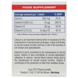 کلسیم یک ماده معدنی مهم است که برای حفظ استخوان های طبیعی در تمام سنین لازم است. همچنین به عملکرد طبیعی عضله کمک می کندو در روند تقسیم سلولی نقش دارد. ویتامین های D و K به حفظ استخوان های طبیعی کمک می کنند. ویتامین D همچنین به جذب و مصرف طبیعی کلسیم، سطح طبیعی کلسیم خون و حفظ عملکرد طبیعی عضلات کمک می نماید. ویتامین E در محافظت از سلول ها در برابر استرس اکسیداتیو موثر می باشد. این محصول تحت لیسانس Euro OTC Pharma GmbH آلمان، در هگمتان داروی غرب تولید و شرکت حکیمان طب کار دارنده پروانه ساخت آن می باشد.
