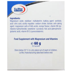 مواد تشکیل دهنده: اکسید منیزیم، مالتودکسترین، سوربیتول ها، اسید سیتریک، سدیم سیترات، لاکتوز، نمک های منیزیم اسیدهای چرب، اسانس پرتقال، ویتامین B6 (پیریدوکسین هیدروکلراید)، سوکرالو، اسید فولیک (پتروییل مونوگلوتامیک اسید) و ویتامین B12 (سیانوکوبالامین).