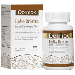 اجزاء و مواد موثره: هر کپسول حاوی 15 میلی گرم بتاکاروتن، 6 میلی گرم ویتامین eف 1.5 میلی گرم لوتئین، 1 میلی گرم لیکوپن، 0.5 میلی گرم آستازانتین و 0.165 میلی گرم زآگزانتین می باشد. مشخصات فرآورده: مکمل تغذیه ای درمکس هلیو برنز، ترکیبی منحصر به فرد حاوی مواد طبیعی مشتق شده از جلبک، مخمر و ویتامین E به عنوان آنتی اکسیدان های طبیعی و سالم جهت محافظت و سلامت بدن به ویژه پوست و چشم ها در برابر اشعه مخرب و مضر نور خورشید و رادیکال های آزاد بوده و در برنزه شدن سریع پوست و همچنین ماندگاری برنزه شدگی پوست توسط نور خورشید تاثیر بسزایی دارد. مواد موثره طبیعی فرآورده شامل ترکیبی خاص از بتا کاروتن (مشتق شده از ویتامین A)، لیکوپن، لوتئین، ویتامین E، آستازاتین و زآگزانتین می باشد که اثر آنتی اکسیدانی و محافظت کنندگی پوست این ترکیبات از اشعه مخرب نور خورشید و رادیکال های آزاد به خوبی شناخته شده می باشد. همچنین این فرآورده با ترکیب منحصر به فرد، اثر حمایتی در افزایش و نگهداری برنزه شدن پوست را دارد.