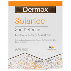 مکمل تغذیه ای درمکس سولاریس، محافظ پوست و چشم ها در برابر نور خورشید می باشد و ترکیب منحصر بفردی از آنتی اکسیدان های طبیعی، جهت کمک به محافظت و سلامت بدن بخصوص پوست و چشم ها در برابر اشعه مخرب و مضر نور خورشید می باشد. این فرآورده علاوه بر کمک به حفظ جوانی پوست، در کمک به تولید ویتامین D3 طبیعی و تقویت سیستم ایمنی بدن در برابر رادیکال های آزاد نیز تاثیر بسزایی دارد.