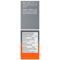 هر کپسول حاوی 200 میلی گرم ریشه گیاه تورمریک 325 میلی گرم عصاره بروملائین 50 میلی گرم استاره صمغ باسلویا می باشد.