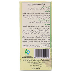 100% طبیعی ترکیبات: تخم خربزه، تخم خیار، تخم بادرنگ، حب القلت، خارخاسک، رازیانه، صمغ آلو، پر سیاوشان، پوست بیخ کبر، تخم کرفس، تخم ترب، زیره کرمانی، سعد