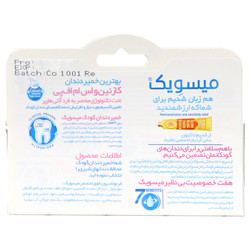از سن 2.5 تا 8 سالگی مسواک زدن باید تحت کنترل کامل والدین انجام گیرد . برای ترغیب بیشتر کودک ، زمان مسواک زدن فرزندتان را با مسواک زدن خودتان تنظیم کنید . برای کودکان بالای 2.5 سال از خمیردندان های مخصوص کودکان با میزان فلوراید کنترل شده و تنها به اندازه یک نخود استفاده کنید. خمیر دندان کودک میسویک حاوی SMPF به منظور تامین میزان مناسب فلوراید برای افزایش استحکام و پیشگیری از پوسیدگی دندان های کودک می باشد که در زمان جایگزینی دندان های دائمی به جای شیری دیرتر به پوسیدگی گرفتار شوند و دندان های دائمی قوی تر روئیده شوند.روش مصرف: