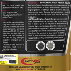 ترکیبات: وی پروتئین ایزوله، شیرین کننده، رنگ و طعم دهنده مجاز خوراکی وی پروتئین ایزوله ساپلند از بهترین منبع پروتئینی یعنی پروتئین وی ایزوله تهیه و با خلوص 100 درصد و جذب بسیار بالا موجب رشد سریع و با کیفیت عضلات می شود. آمینواسیدهای شاخه دار (BCAA) موجود در این محصول با تقویت و استحکام عضلات روند تولید پروتئین در بافت را تسریع می بخشد.