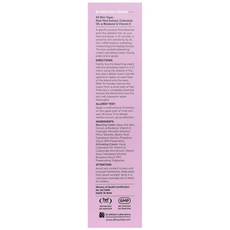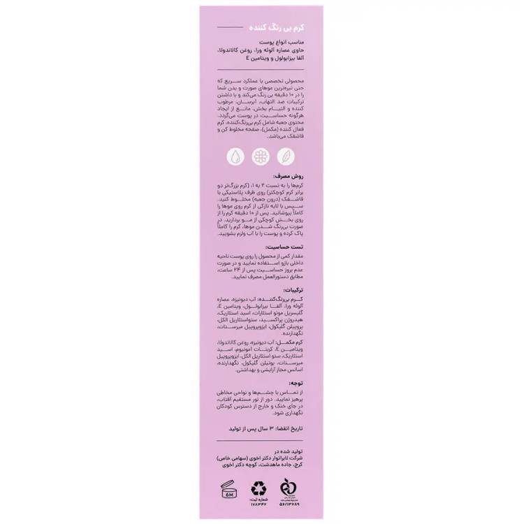قبل از هر بار مصرف : کرم را طبق روش ذکر شده روی پوست ظریف داخل بازو، تست کنید. در صورت عدم بروز حساسیت یا قرمزی، کرم را طبق روش ذکر شده استفاده نمایید. هر جعبه شامل : 1 تیوب کرم بی رنگ کننده 60 میلی لیتر 1 تیوب کرم مکمل 30 میلی لیتر 1 بشقابک پلاستیکی 1 قاشقک پلاستیکیروش مصرف: