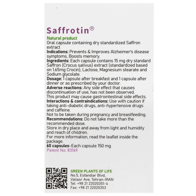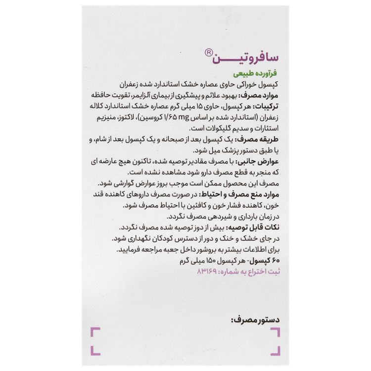 سافروتین، حاوی 60 کپسول و مناسب برای استفاده به مدت 30روز میباشد.