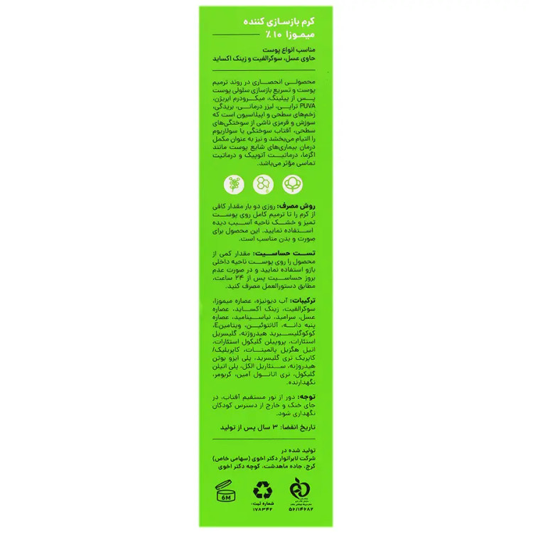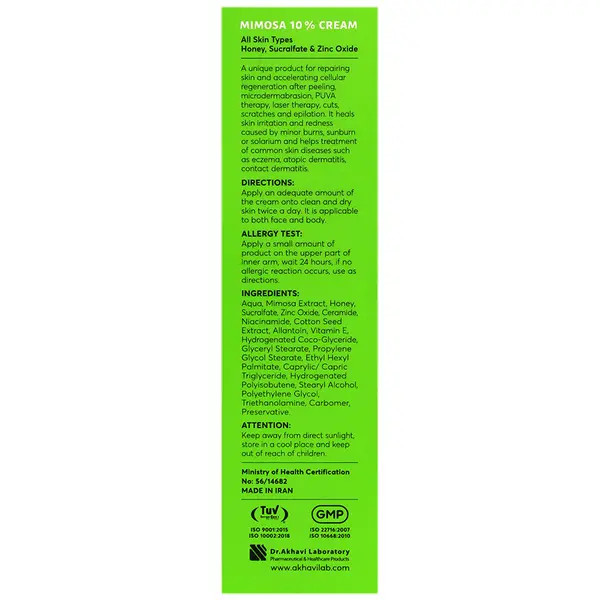 امروزه با توجه به کاربرد وسیع لیزر، پیلینگ (لایه برداری شیمیایی)، میکرودرم ابرژن و PUVA تراپی در امور مربوط به زیبایی پوست و برطرف کردن مشکلات پوستی، لزوم مراقبت های پوستی قبل و بعد از به کارگیری هر یک از روش های فوق (که در زیر به اختصار توضیح داده شده) کاملاً ضروری است تا از ایجاد هرگونه اسکار و لک و عفونت های جلدی جلوگیری شود. با توجه به این نیاز محققین لابراتوار دکتر اخوی به به کار گیری تکنولوژی روز اروپا کرم ترمیم کننده میموزا 10% سی گل را فرموله و به جامعه پزشکی عرضه کردند. - پیلینگ شیمیایی پوست روشی است برای بردشتن لایه شاخی پوست از طریق ایجاد سوختگی شیمیایی. - میکرودرم ابرژن ایجاد خراشیدگی سطحی است با استفاده از وسایل مکانیکی مانند سمباده یا برس های سیمی بسیار ظریف به منظور تحریک اپی تلیزاسیون مجدد همراه با حداقل اسکار. - لیزر درمانی روشی است برای تخریب بافت تحت درمان با استفاده از توانایی لیزر در تولید پرتو نوری متمرکز و قوی و تابش دقیق آن بر روی موضع مورد نظر. - PUVA تراپی نوعی فتوتراپی است برای درمان بعضی اختلالات پوستی مانند پسوریازیس و ویتیلیگو (برص). در این روش هسته سلول را با پسورالن حساس می کنند و سپس با تاباندن UVA آن بافت را می سوزانند. ترمیم آسیب سلولی حاصل می تواند با ملانیزاسیون اپیدرم همراه باشد که از این خاصیت در درمان ویتیلیگو سود می برند. - الکترولیز روشی مؤثر است برای حذف دائمی موهای زائد. اساس آن قرار دادن یک سوزن فلزی ظریف روی فولیکول مو با هدف تخریب سلول های فعال ریشه می باشد. - اپیلاسیون روشی برای برداشتن موهای زائد از ریشه است که معمولاً با آزردگی خفیف موضع همراه می باشد. کرم ترمیم کننده میموزا 10% سی گل به رفع قرمزی و کاهش التهابات ایجاد شده پس از لیزر درمانی و ... کمک کرده و روند ترمیم و بازسازی پوست را تسریع می کند. کرم ترمیم کننده میموزا 10% سی گل همچنین از تکثیر و رشد باکتری ها و قارچ ها جلوگیری می کند که این خود باعث تسریع در روند تولید سلول های جدید و در نتیجه تسریع در فرایند ترمیم زخم های سطحی و بریدگی ها می شود. این کرم همچنین جهت کاهش التهابات احتمالی پس از اپیلاسیون و الکترولیز کارایی فوق العاده ای دارد. کرم ترمیم کننده میموزا 10% سی گل دارای مواد مؤثر زیر می باشد : عصاره میموزا، عصاره پنبه دانه، سوکرالفیت، سولفات روی، سولفات مس، اکسید روی، آلانتوئین و ویتامین E - عصاره پوست ریشه میموزا (Mimosa Tenuiflora Bark Extract) : پوست ریشه این درختچه که در امریکای لاتین می روید سالهاست که برای ترمیم پوست پس از آسیب دیدگی هایی مانند سوختگی به کار می رود. این عصاره حاوی تانین و ساپونین، فیتوسترول و ترکیبات آلکالوئیدی مانند دی متیل تریپتامین می باشد. خاصیت های جوان کنندگی پوست و اثر ضد میکروبی نیز برای این عصاره گزارش شده است. - عصاره پنبه دانه (Extract Cotton Seed) : این ماده دارای اثرات ترمیمی، نرم و مرطوب کنندگی و ضد التهابی است. - سوکرالفیت (Sucralfate) : این ماده احتمالاً با اتصال به فاکتور رشد فیبروبلاست پایه (bfGf)، مانع از تخریب آن شده و باعث آنژیوژنز می شود. اثر ضد میکروبی علیه تعدادی از باکتری های گرم منفی نیز برای آن گزارش شده است. - سولفات روی (Sulfate Zn) : این ماده به علت ویژگی های قابضش در بعضی از اختلالات پوستی (مانند درماتیت تماسی) به صورت سطحی استفاده می شود. - سولفات مس (Sulfate Cu) : این ماده بر سطوح مخاطی خاصیت قابض دارد. علاوه بر این سولفات مس دارای خاصیت ضد میکروبی و ضد قارچی نیز هست. - اکسید روی (Zn Oxide) : این ماده از دیرباز به علت قابض بودن در درمان اگزما، خراشیدگی های سطحی، زخم ها و به علت خاصیت ضد میکروبی در درمان بیماری های عفونی پوست مورد استفاده قرار می گرفته است. علاوه بر این اکسید روی خاصیت آنتی اکسیدان و التیام بخشی فوق العاده ای دارد. - آلانتوئین : این ماده قابض و کراتولیتیک است. اثرات مختلف آن عبارتند از ترمیم پوست آسیب دیده در اثر عوامل خارجی، تقویت نوسازی سلولی پوست، کاهش تبخیر نامحسوس آب میان سلولی 