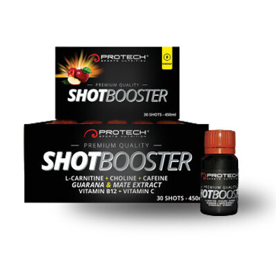شات بوستر یک مکمل خیلی خوب براي قبل ازتمرین است تا آماده سازي و تقویت لازم براي تمرین را ارائه دهد. این محصول در بطري هاي کوچک 15 میلی لیتري ارائه می گردد که به راحتی قابل حمل است. در فرمولاسیون آن از مواد فعال از قبیل ال کارنیتین، کولین، عصاره گوارانا، عصاره ماته (چاي برزیلی)، ویتامین C و B12 بکار رفته که به کاهش خستگی و متابولیسم انرژي زایی طبیعی کمک شایانی می کند. همچنین با طعم طبیعی سیب همراه است.