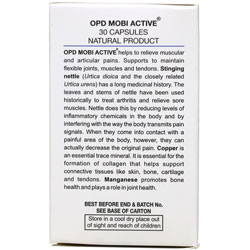 کپسول اوپی دی موبی اکتیو برای کاهش درد عضلانی، مفصلی و حفظ انعطاف پذیری مفاصل و ماهیچه ها فراهم شده است این کپسول حاوی ترکیبات منحصر به فردی از عصاره برگ گیاه گزنه، ویتامین ث، منگنز و مس می باشد. که سبب کاهش درد و بهبود عملکرد مفاصل و ماهیچه ها می شود. عصاره برگ گیاه گزنه موجود در این محصول باعث کاهش التهاب و دردهای روماتیسمی می شود. گزنه از طریق مهار KB NF- سبب کاهش بیان سایتوکاینهای التهابی مانند TNF-α، IL-6 و IL-1B که نقش مهمی در ایجاد بیماری های رماتیسمی دارند، می شود. برگ گزنه حاوی ویتامینD و K به ویژه K2 که عملکرد استخوان ها را در بیماران رماتیسمی بهبود می بخشد. همچنین این گیاه حاوی کلسیم، منیزیم و پتاسیم می باشد؛ بنابراین پنج ماده مغذی مهم برای حفظ ساختار و عملکرد استخوان را دارا می باشد. ویتامین C موجود در این محصول با فعالیت آنتی اکسیدانی قوی خود سبب مهار آسیب های ناشی از رادیکال های آزاد شده و به این وسیله از اکسیداسیون غضروف ها جلوگیری می کند. مصرف ویتامین C میزان التهاب مفاصل را نیز کاهش می دهد. منگز و مس از مهم ترین عناصر موجود در کپسول موبی اکتیو می باشد که نقش مهمی در سنتز ماتریکس استخوان داردند. منگز سبب کلسیفیکاسیون عمومی استخوان و مس سبب سنتز کلاژن می شود.